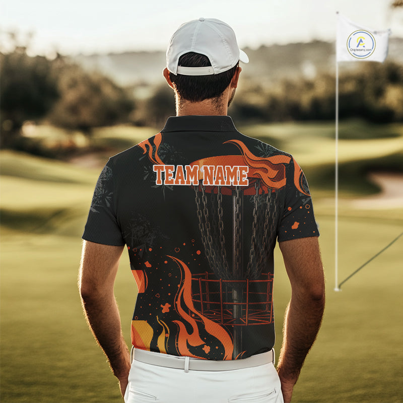 Black and Orange Flame Disc Golf basket Mens Disc golf polo shirts Custom team disc golf outfit NQS10811