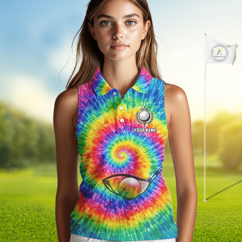 Colorful rainbow tie-dye Sleeveless golf polo shirt custom Ladies golf outfit, personalized golf gift NQS11724