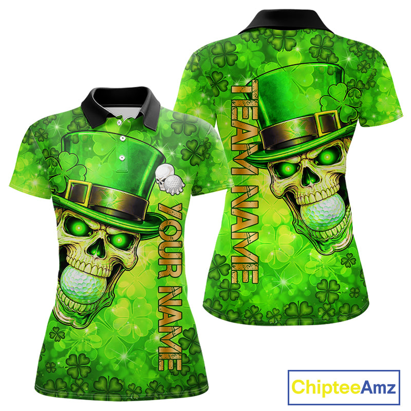 Funny Skull green shamrock pattern Golf Polo Shirts For Women Custom St Patrick's Day ladies golf top NQS11662