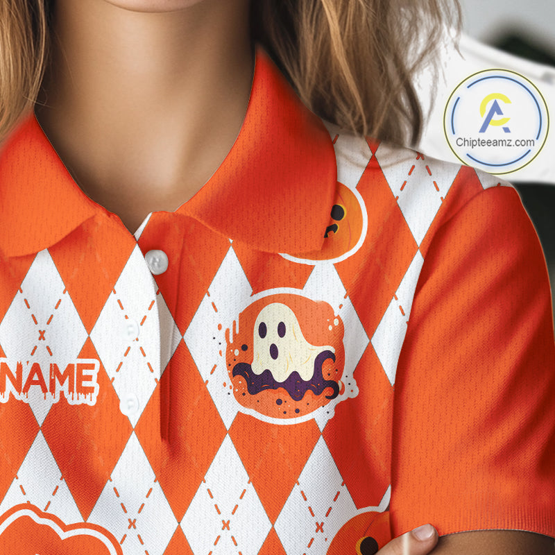 Orange argyle pattern pumpkin Golf Polo Shirt For Women Custom Halloween ladies golf outfit NQS10776