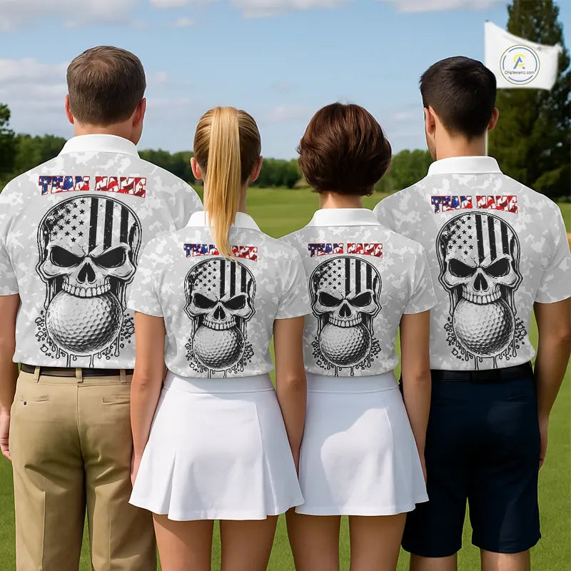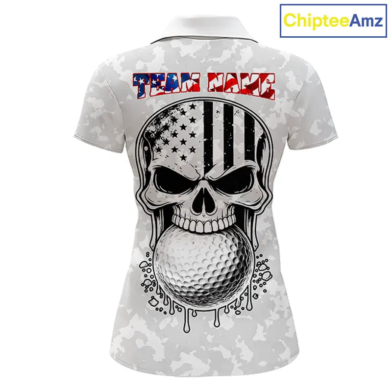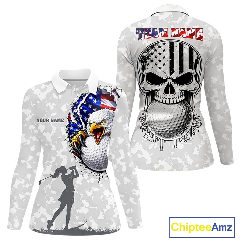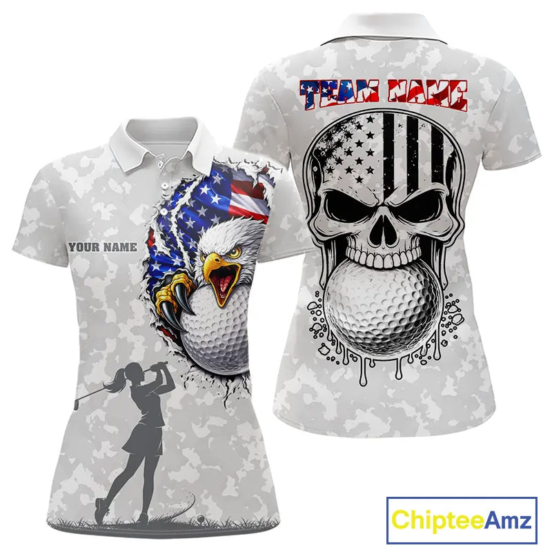 Personalized American Flag Skull Eagle Camo Golf Polo Shirts For Women, Patriotic Ladies Golf Outfits NQS11649