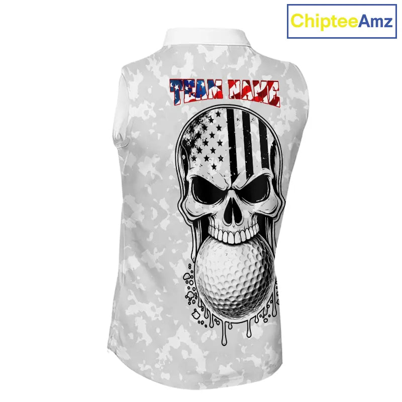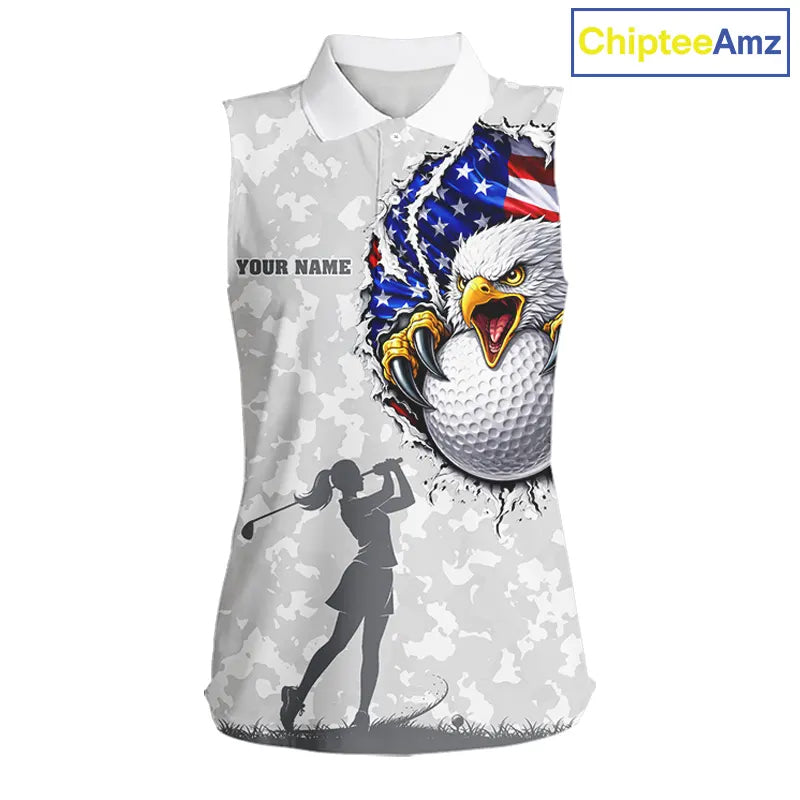 Personalized American Flag Skull Eagle Camo Sleeveless Golf Polo Shirt, Patriotic Ladies Golf Outfits NQS11649