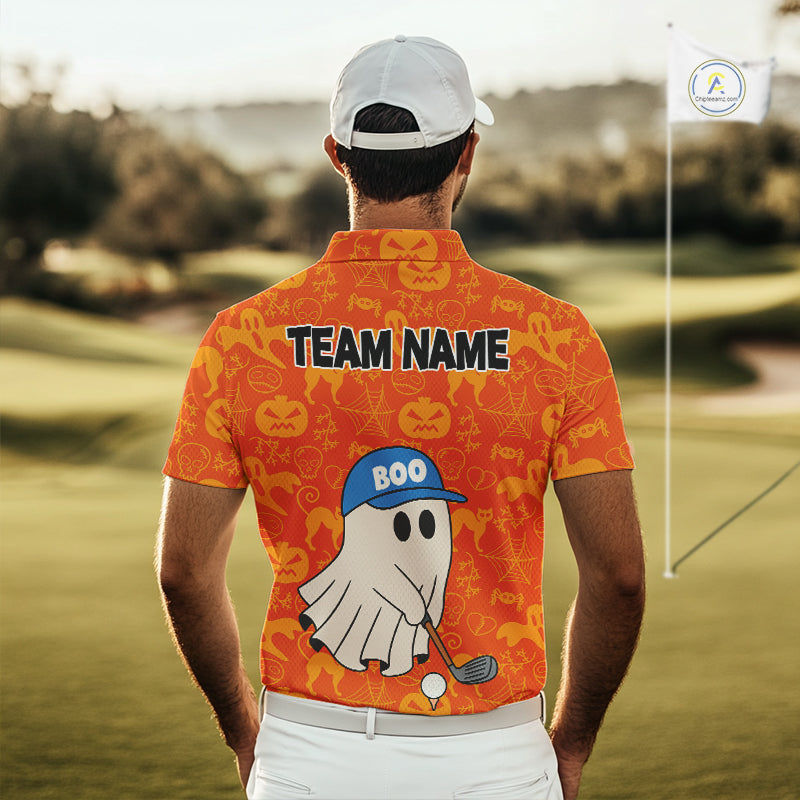 Personalized Funny Halloween Boo Orange Pattern Golf Polo Shirts For Men, Halloween Mens Golf Attire NQS10837