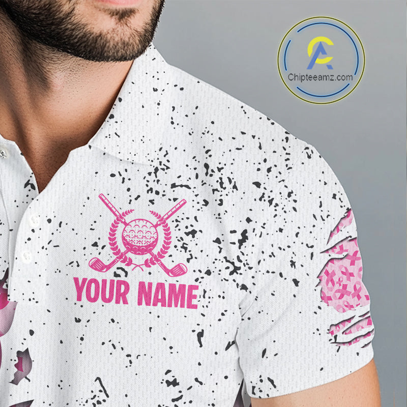 Pink ribbon white grunge pattern Mens golf polo shirt custom breast cancer awareness mens golf top NQS10386
