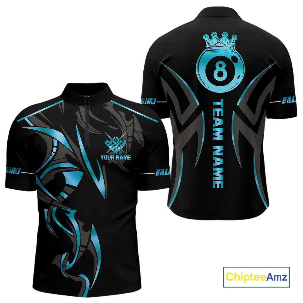 Custom 8 Ball Pool Crown Men Billiard Shirts, Blue Cyan And Black Billiard Team Shirt Pool Jerseys TDM4729