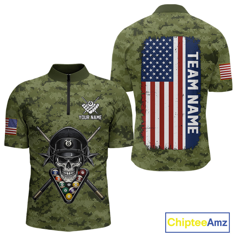 Personalized Military Green Camo Skull Billiard Shirt For Men, Patriotic US Flag Pool Team Jersey TDM5167