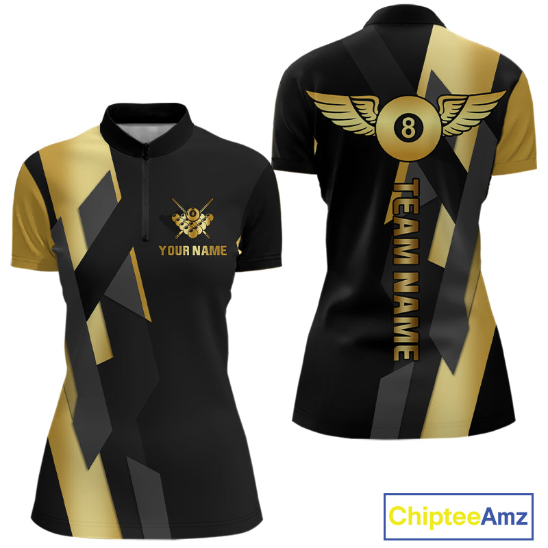 Black And Golden 8 Ball Wings Billiard Shirt For Women Custom Pool Team Jersey Polo & Quarter Zip TDM4203