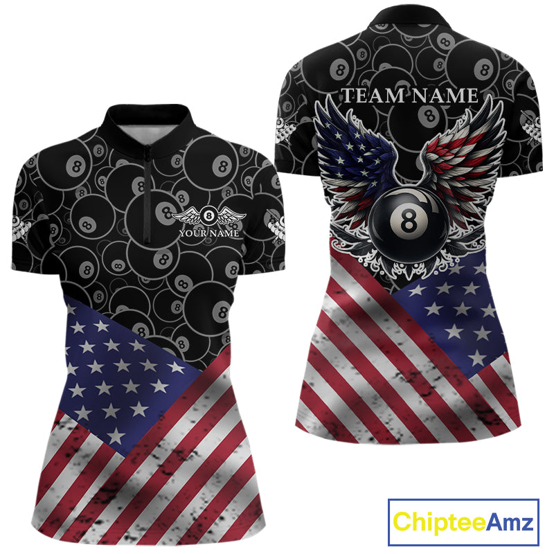 Personalized American Flag 8 Ball Wings Billiard Shirt For Women, Patriotic Pool Team Jerseys TDM4435
