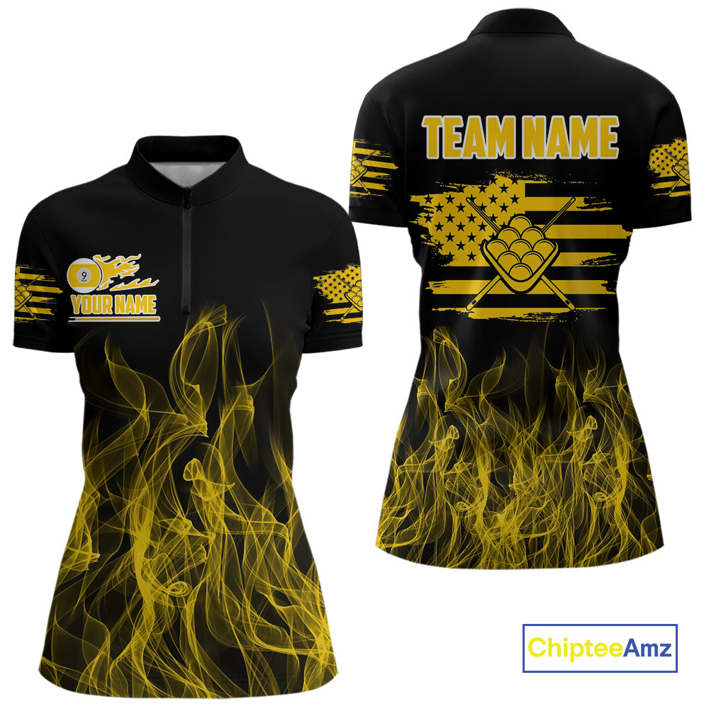 Yellow Flaming US Flag 9 Ball Billiard Shirt For Women Custom Patriotic Pool Player Team Jersey TDM4548