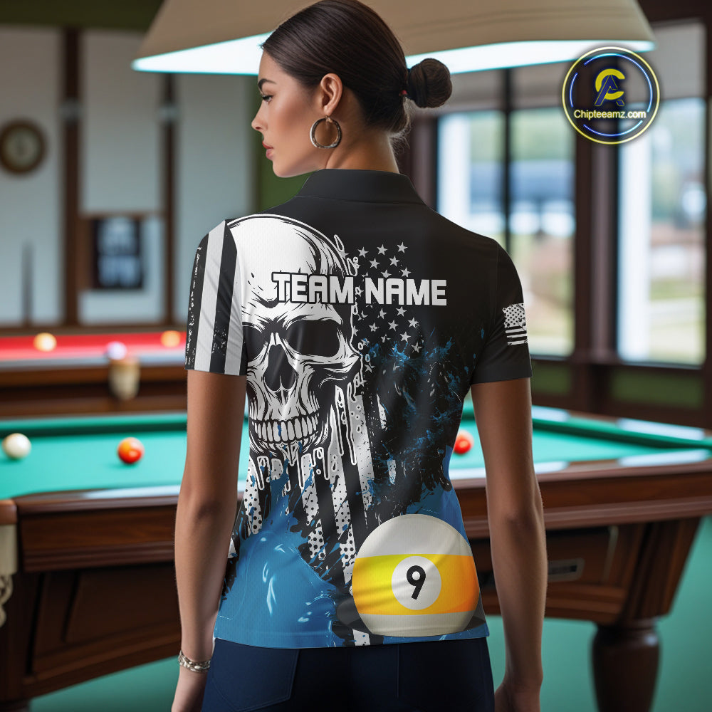 Personalized 8 & 9 Ball Pool Skull Billiard Shirt For Women Custom Grunge Billiard Team Jersey |Blue TDM4649