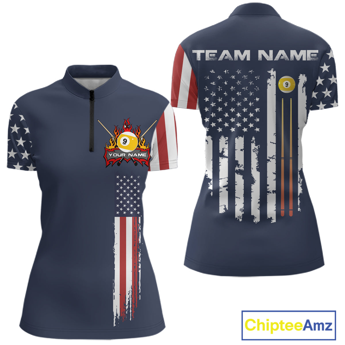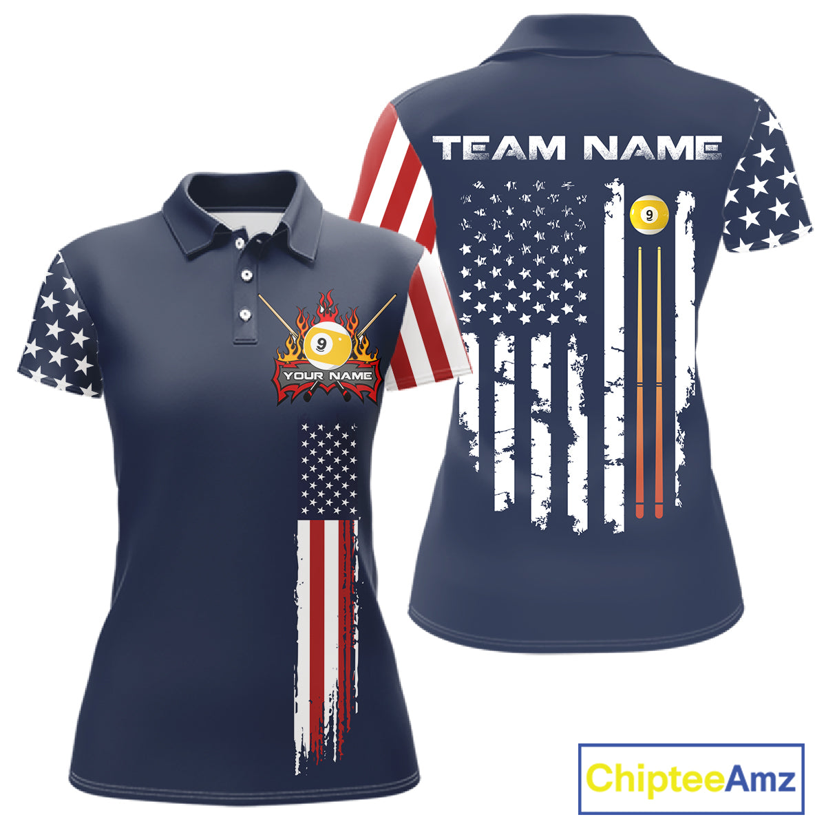 Personalized American Flag Blue Navy 9 Ball Pool Team Shirt For Women Custom Patriotic Billiard Shirt TDM4735