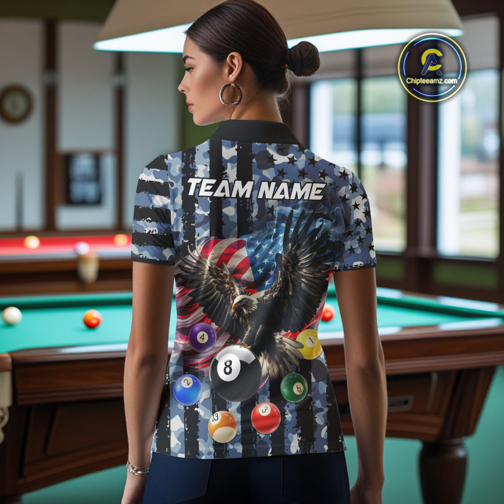 Blue Camo American Flag Eagle 8 Ball Billiard Shirt For Women Custom Patriotic Pool Team Jerseys TDM4809