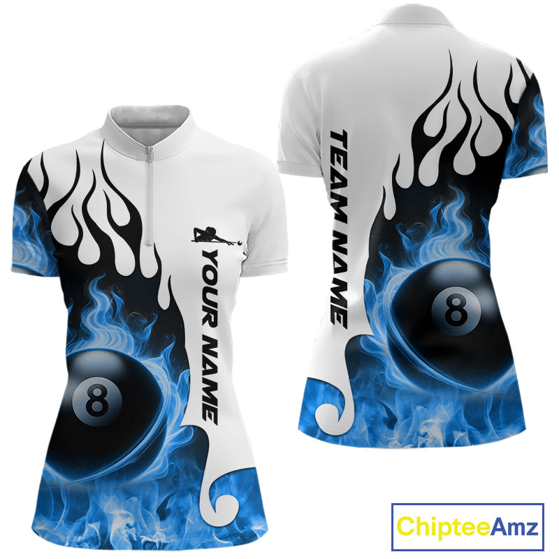Personalized Blue 8 Ball Fire Flame Women's Billiard Shirt Custom Pool Team Jersey Polo & 1/4 Zip TDM5230