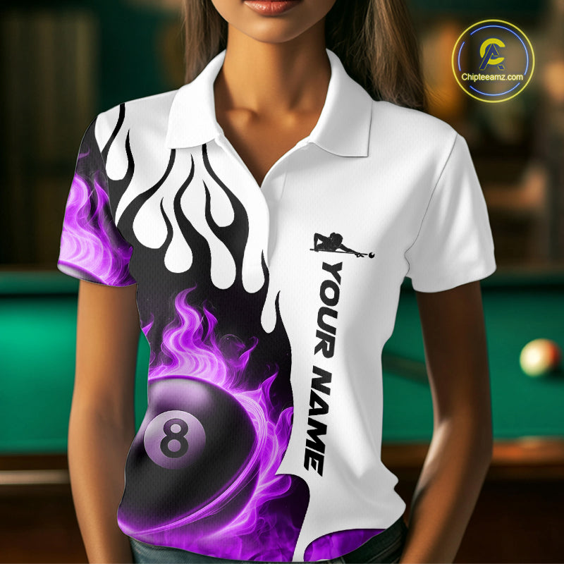 Personalized Purple 8 Ball Fire Flame Women's Billiard Shirt Custom Pool Team Jersey Polo & 1/4 Zip TDM5231
