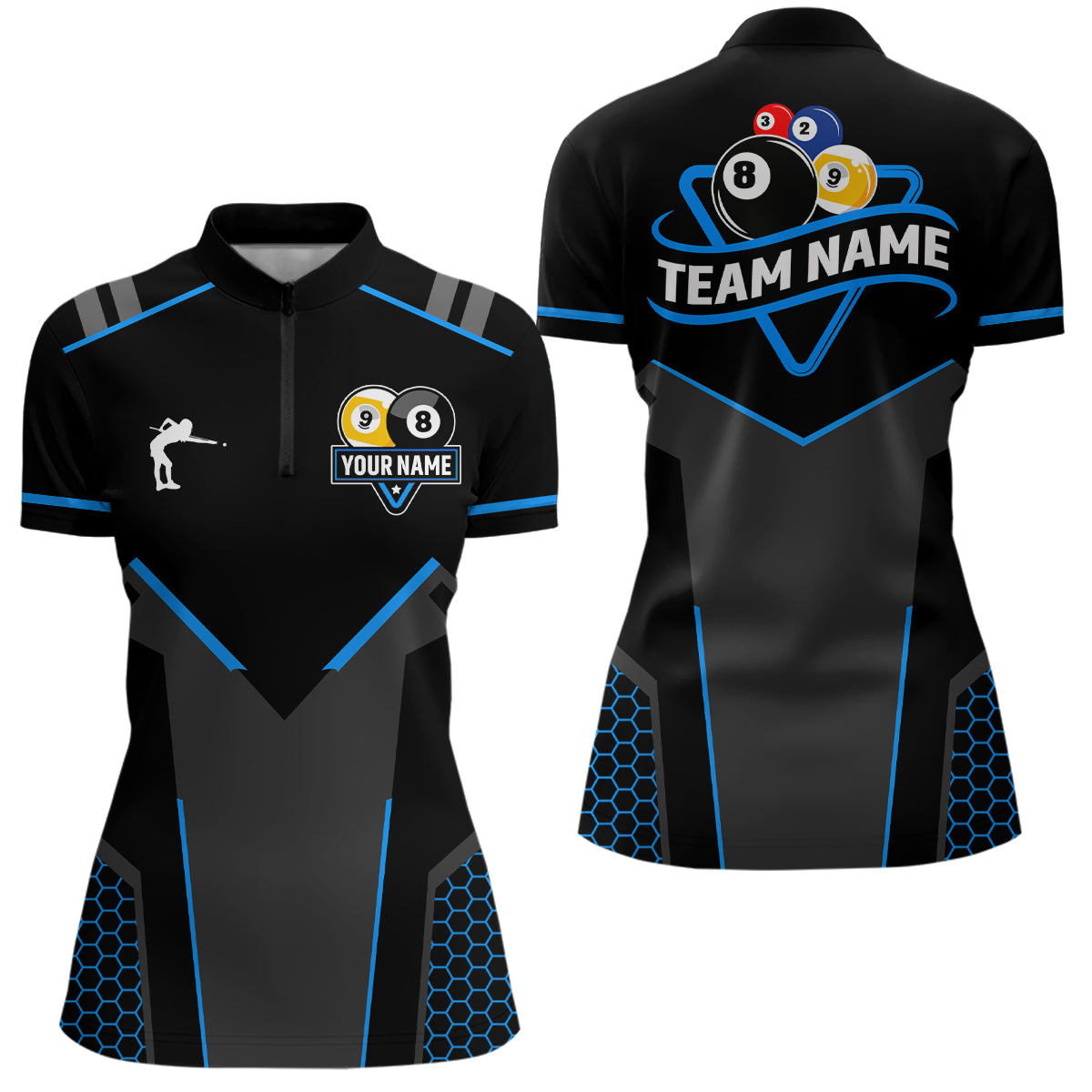 Personalized 8 Ball & 9 Ball Pool Billiard Polo, 1/4 Zip For Women Custom Team Billiard Jerseys |Blue TDM3547