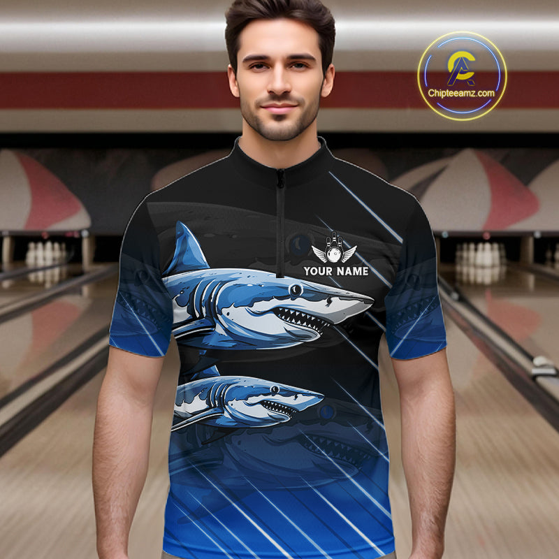 Black and blue shark bowling shirt for men custom lightning thunder bowling polo, quarter zip shirts NQS11378