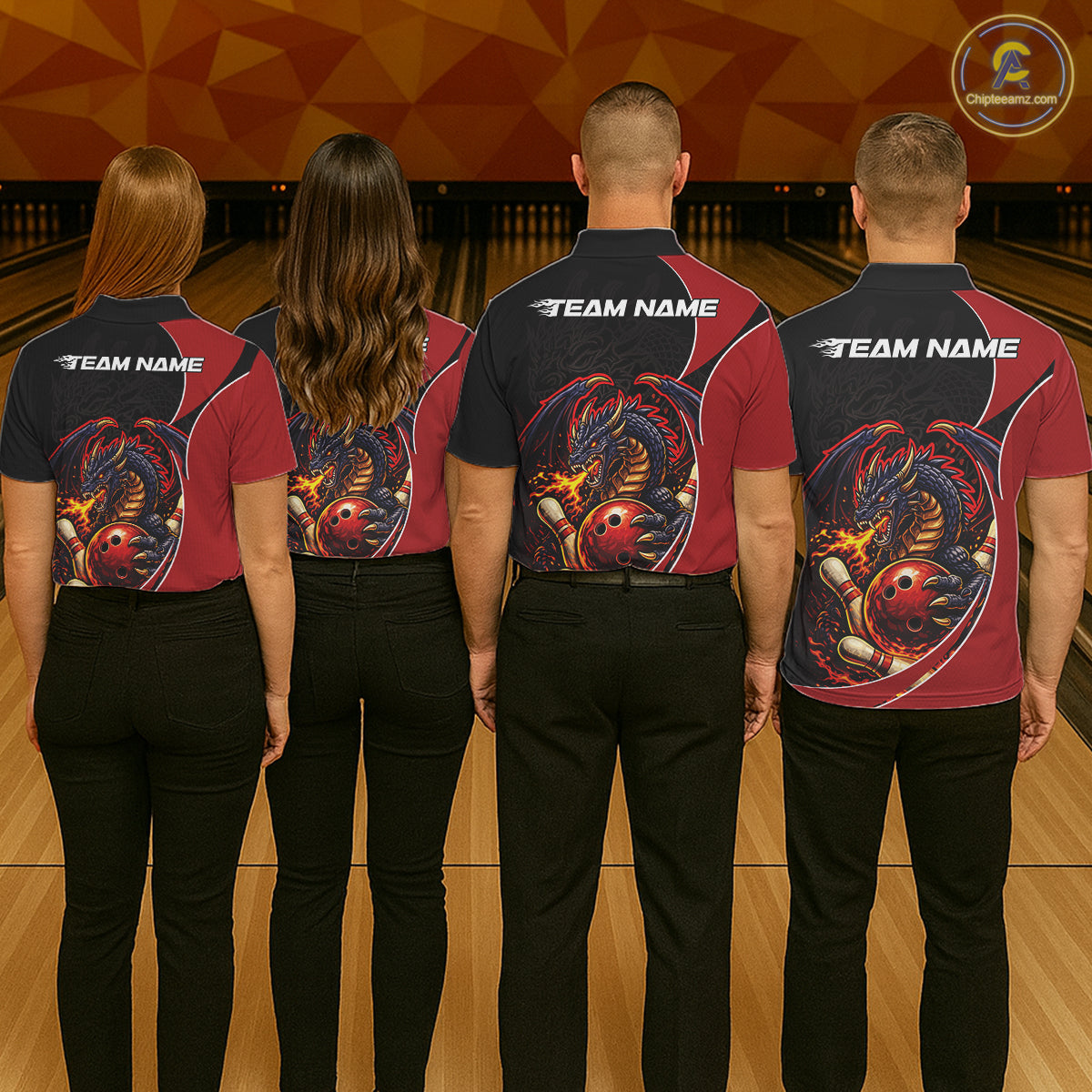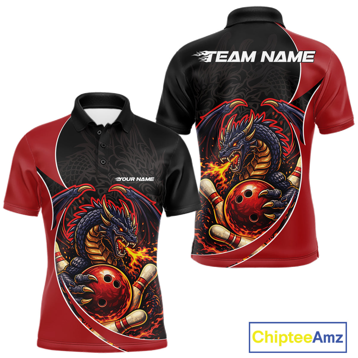 Custom Black And Red Fire Dragon Bowling Jerseys, Dragon Bowling Team Men Polo Shirt IPHW10365