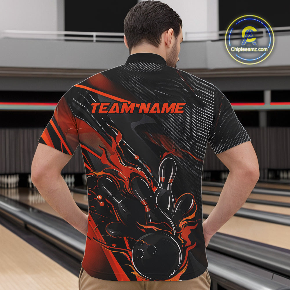 Custom Black And Orange Flame Bowling Team Men Quarter-Zip Shirts, Fire Bowling Jerseys IPHW9780