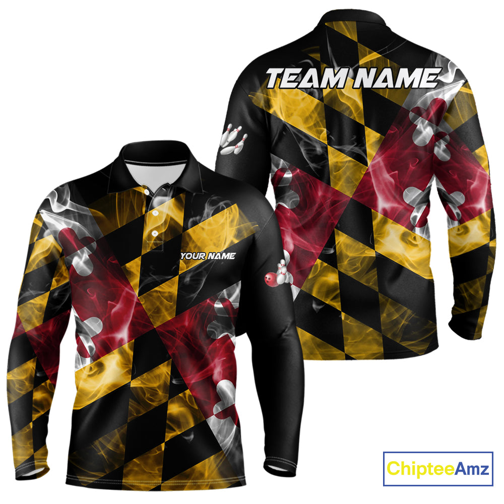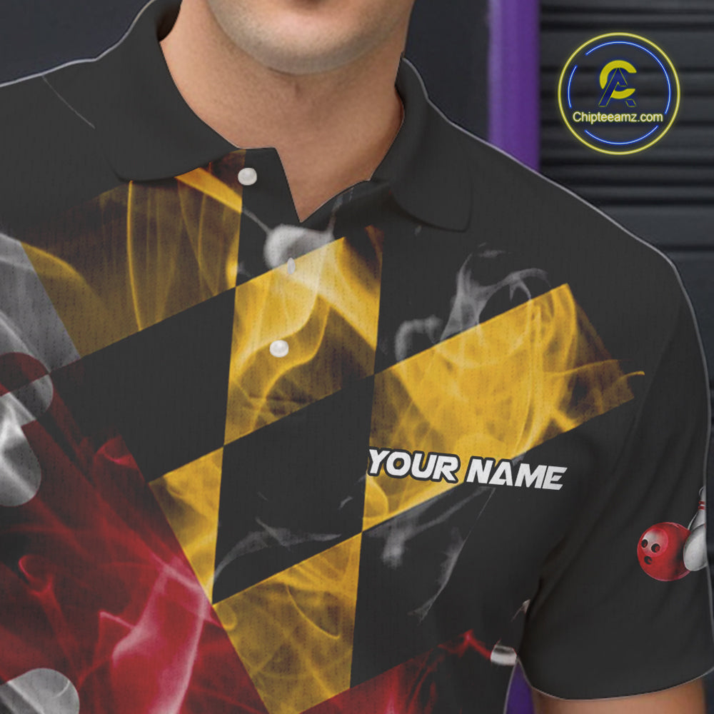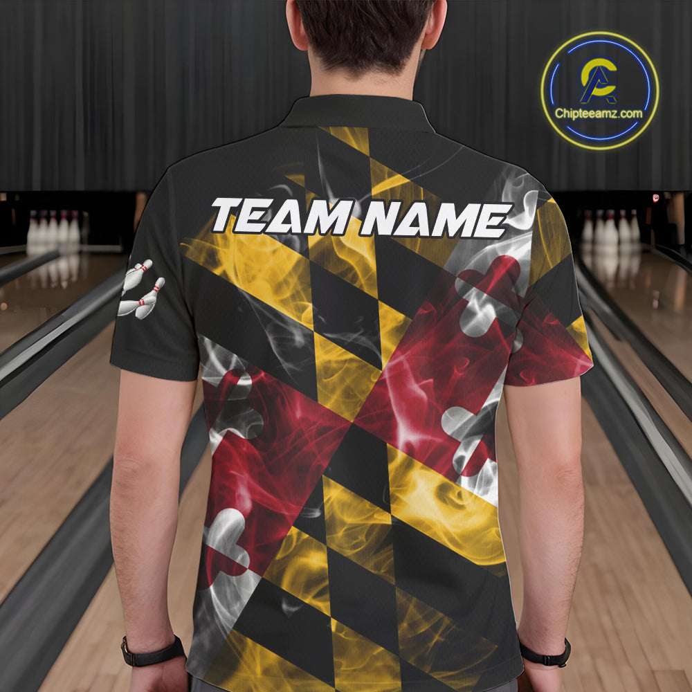 Smoke Maryland Flag Black Bowling Polo, 1/4 Zip shirt for men Custom patriotic Team bowling jersey NQS10322