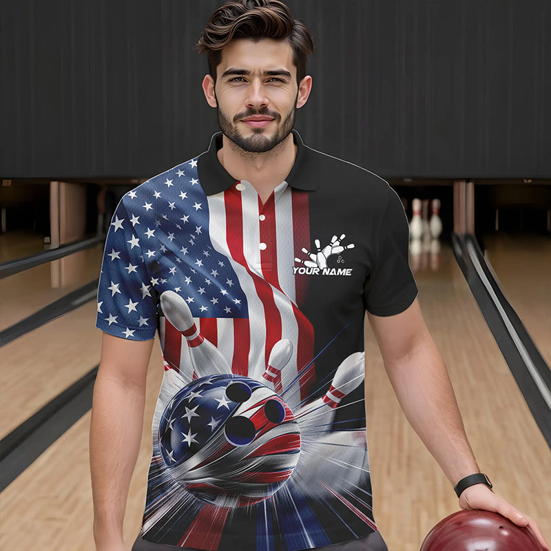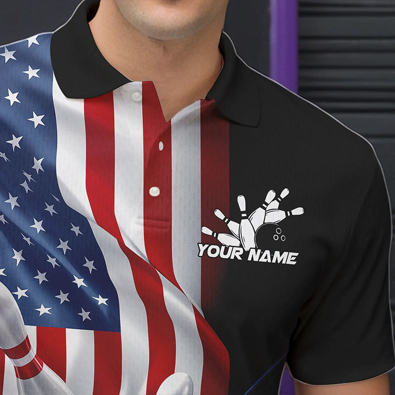 Custom US Flag Bowling League Shirts, Patriotic Bowling Team Polo Shirts For Men IPHW8384