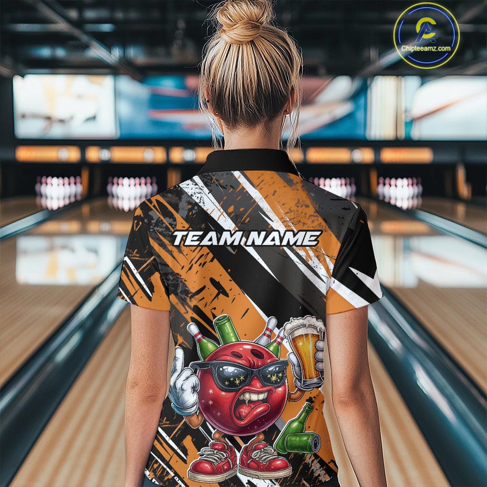 Custom Funny Bowling Ball Drink Beer Bowling Women Polo Shirt, Grunge Orange Team Shirt IPHW10118
