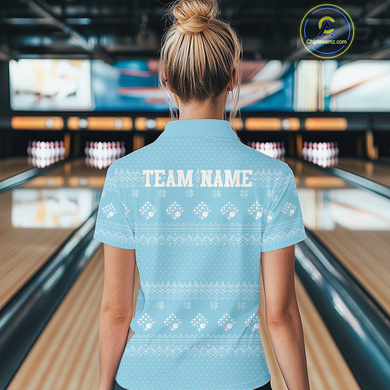 Custom Funny Santa Christmas Women Bowling Polo Shirts, Light Blue Xmas Team Outfit IPHW10142