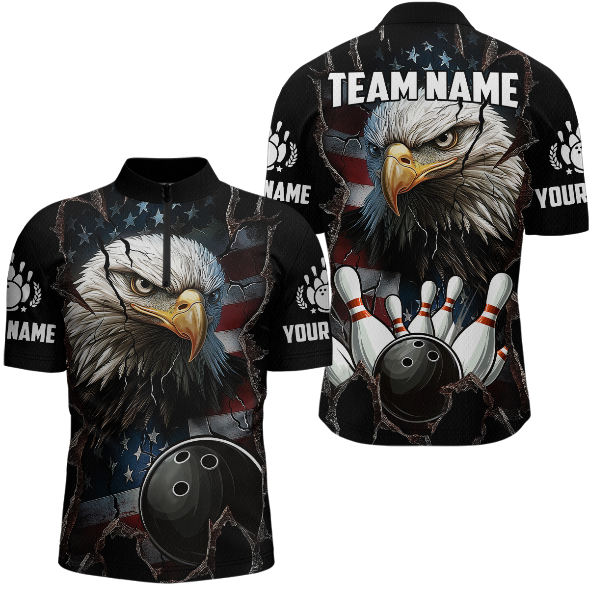 US Flag Eagle Bowling Shirt for Men Personalized Polo & Quarter-Zip Team Bowling Jersey with Team HNT02