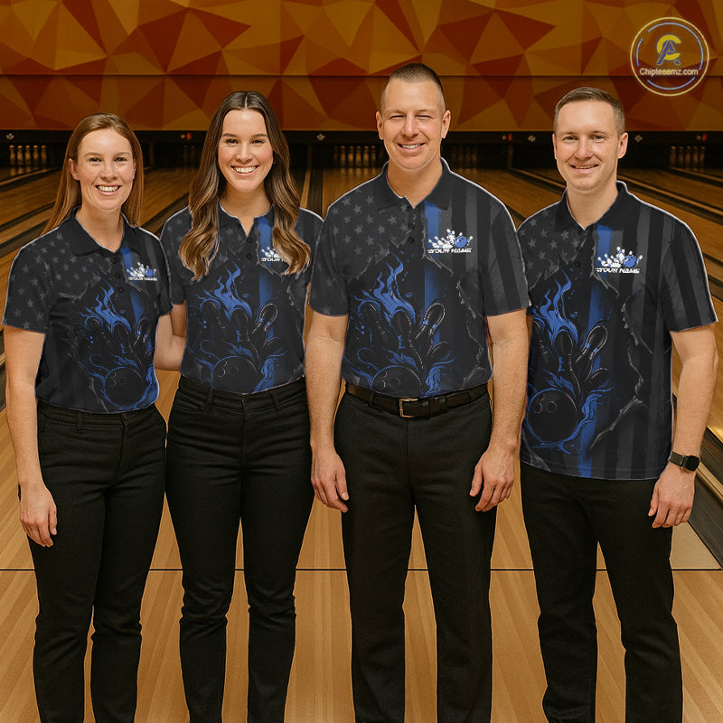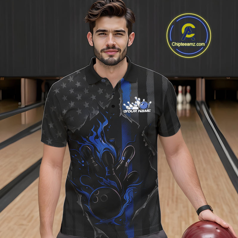 Custom Blue Thin Line American Flag Patriotic Flame Bowling Team Men Polo Shirts IPHW10180