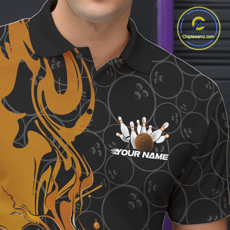 Custom Black And Gold Flame Bowling Team Men Polo Shirts, Yellow Bowling League Shirt IPHW10188