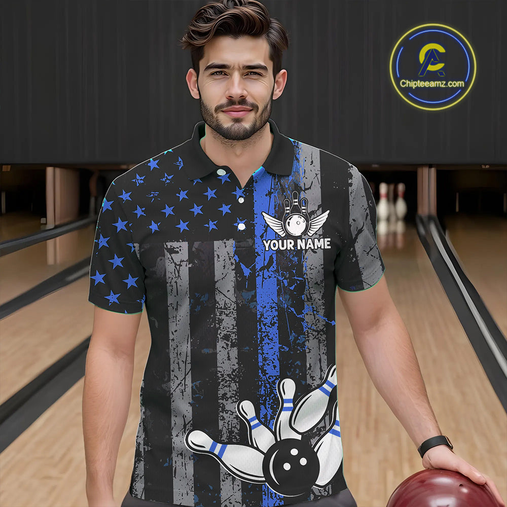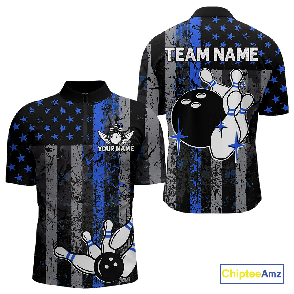 Blue Grunge American Flag Patriotic Bowling Shirt For Men Custom Bowling Team Jersey Polo, 1/4 Zip TDM4851