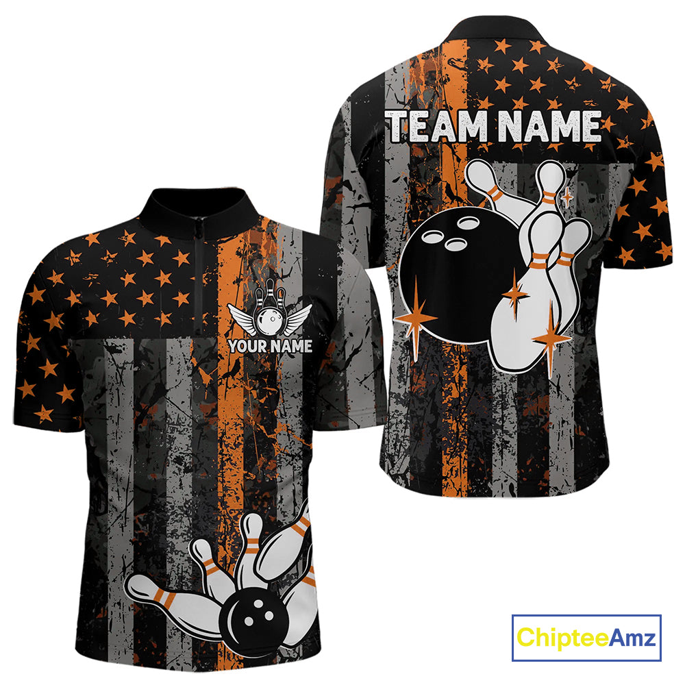 Orange Grunge American Flag Patriotic Bowling Shirts For Men Custom Bowling Team Jerseys TDM4852