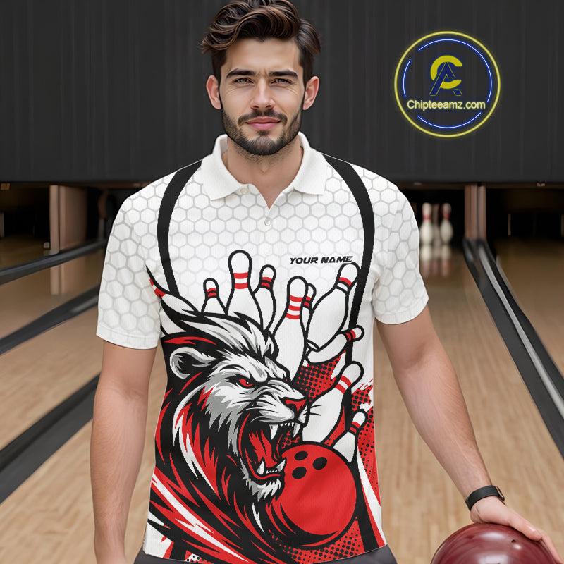 Custom Red Lion Bowling Men Polo Shirt, Lion Bowling Team League Shirt IPHW10124