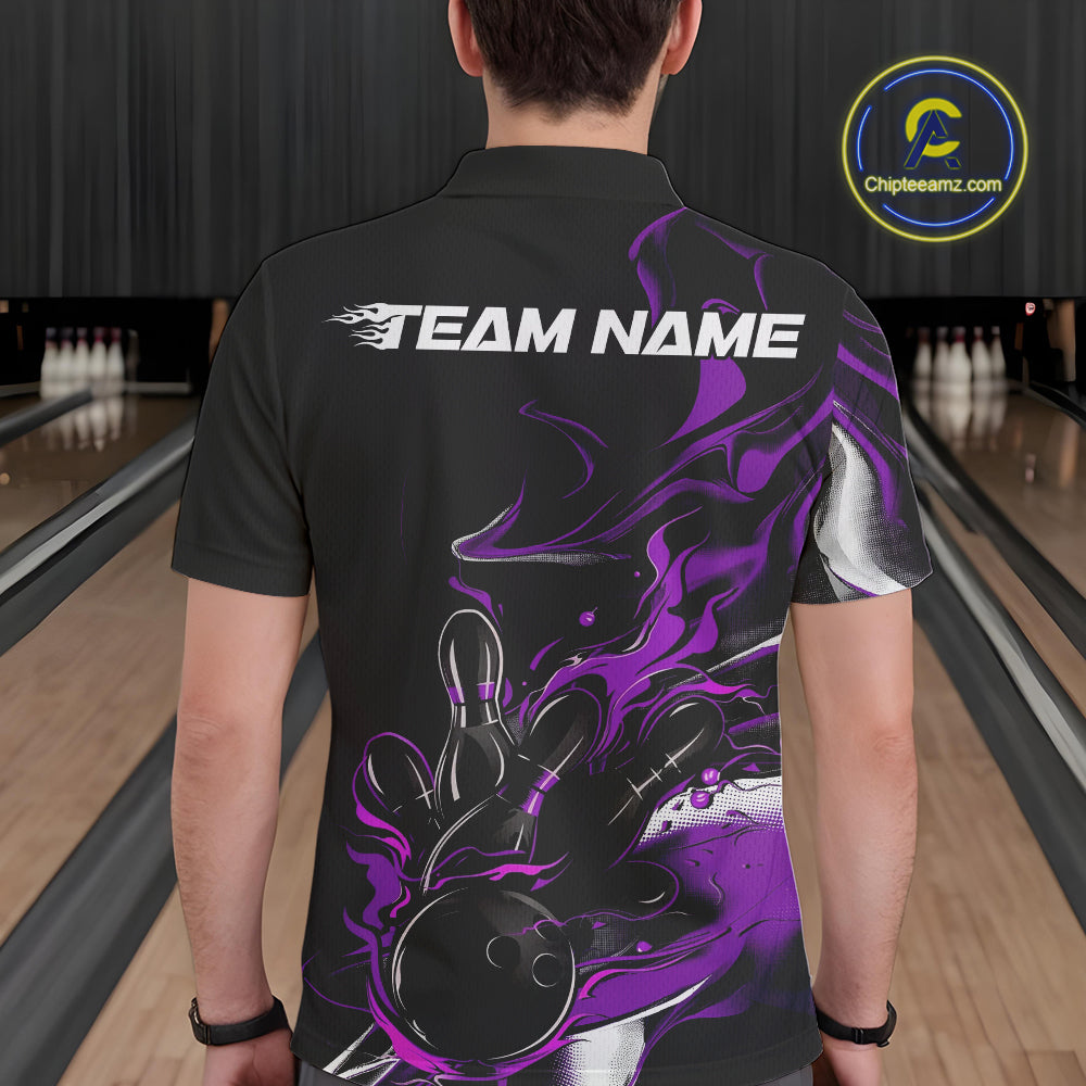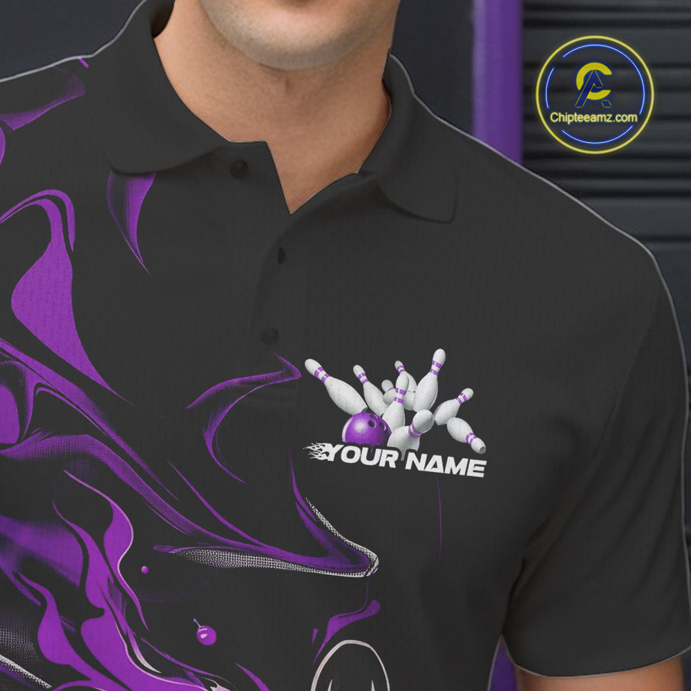 Custom Black And Purple Camo Flame Bowling Team Polo Shirts For Men, Bowling Jerseys IPHW9879