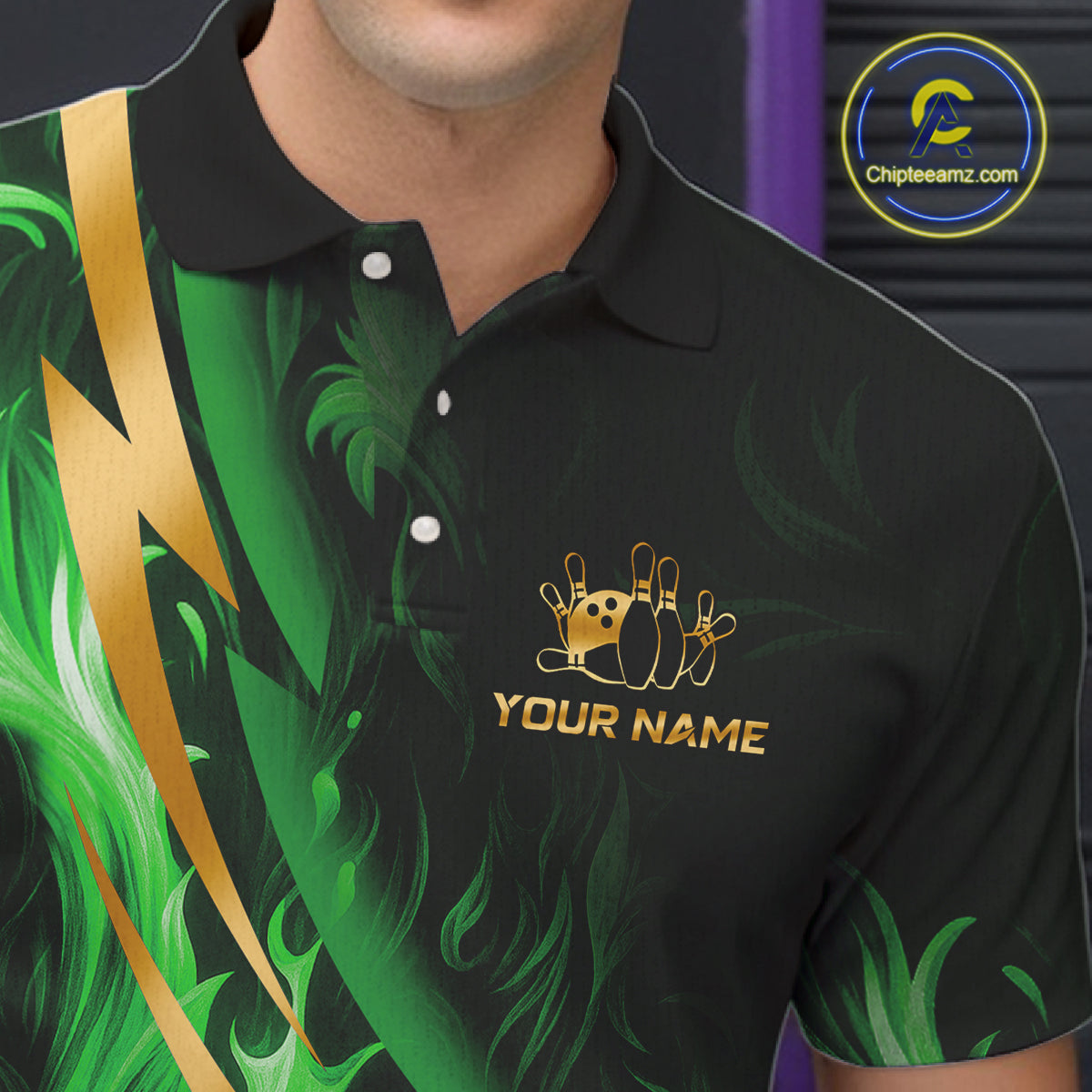 Personalized Bowling Polo, Quarter Zip Shirts for Men Custom Green Flame and Gold Bowling Team Jersey NQS11145