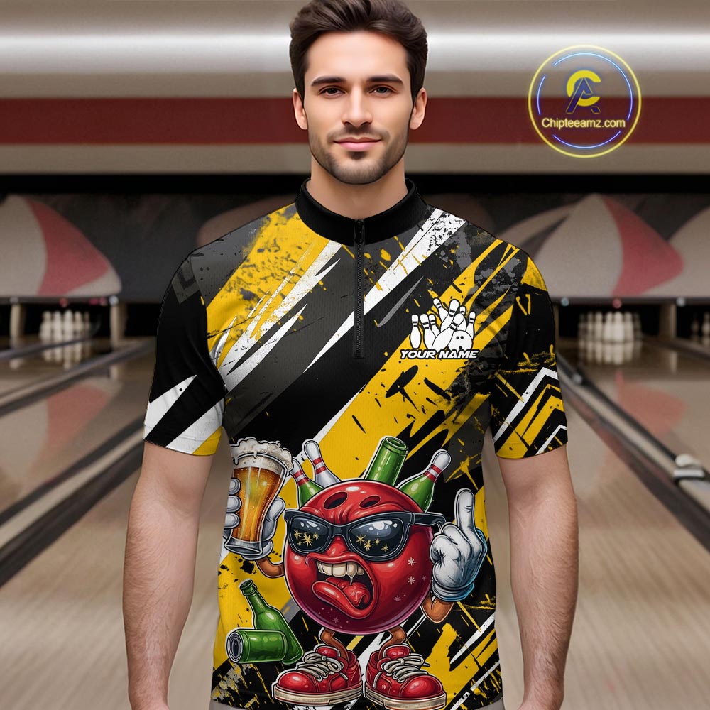 Custom Funny Bowling Ball Drink Beer Bowling Men Quarter-Zip Shirt, Grunge Yellow Team Shirt IPHW10119