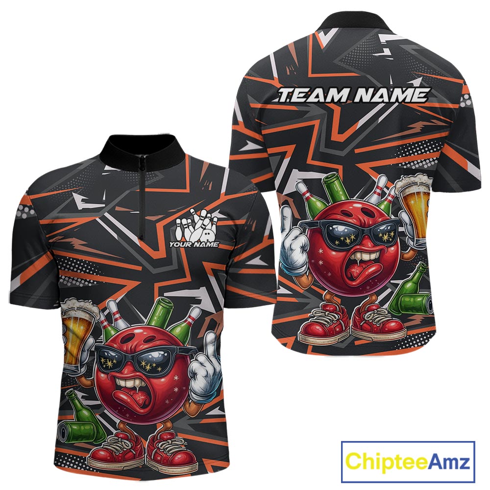 Custom Funny Bowling Ball Drink Beer Bowling Men Quarter-Zip Shirt, Orange Bowling Team Shirt IPHW10121