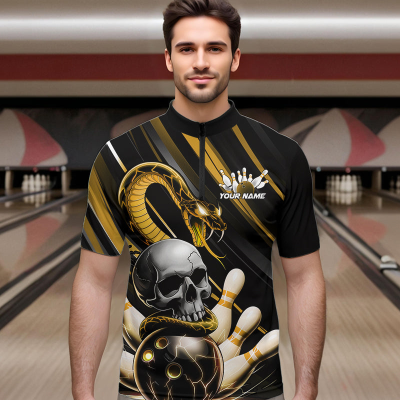 Custom Black And Yellow Snake Skull Bowling Quarter-Zip Shirts For Men, Bowling Team Shirt IPHW8671