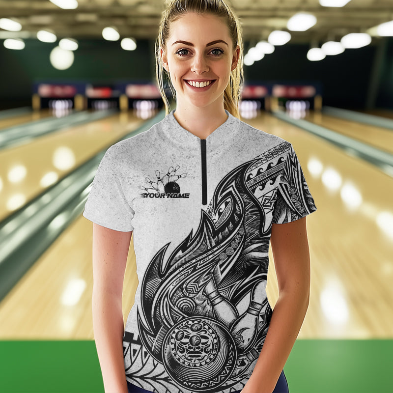 Custom Grunge Black And Gray Tribal Flame Polynesian Bowling Team Womens Quarter-Zip Shirts IPHW8804