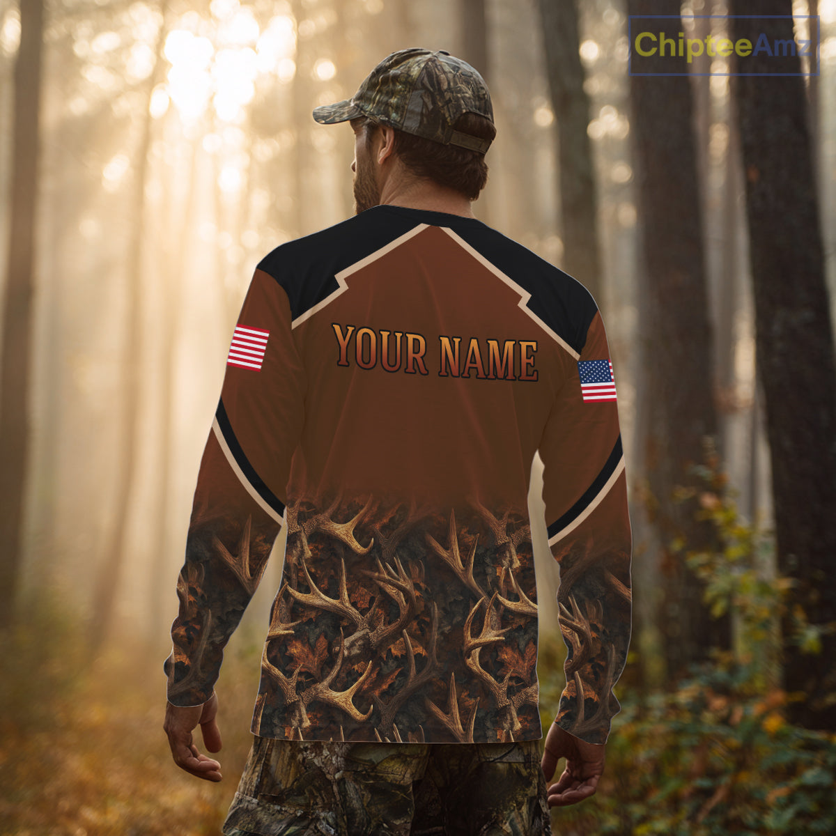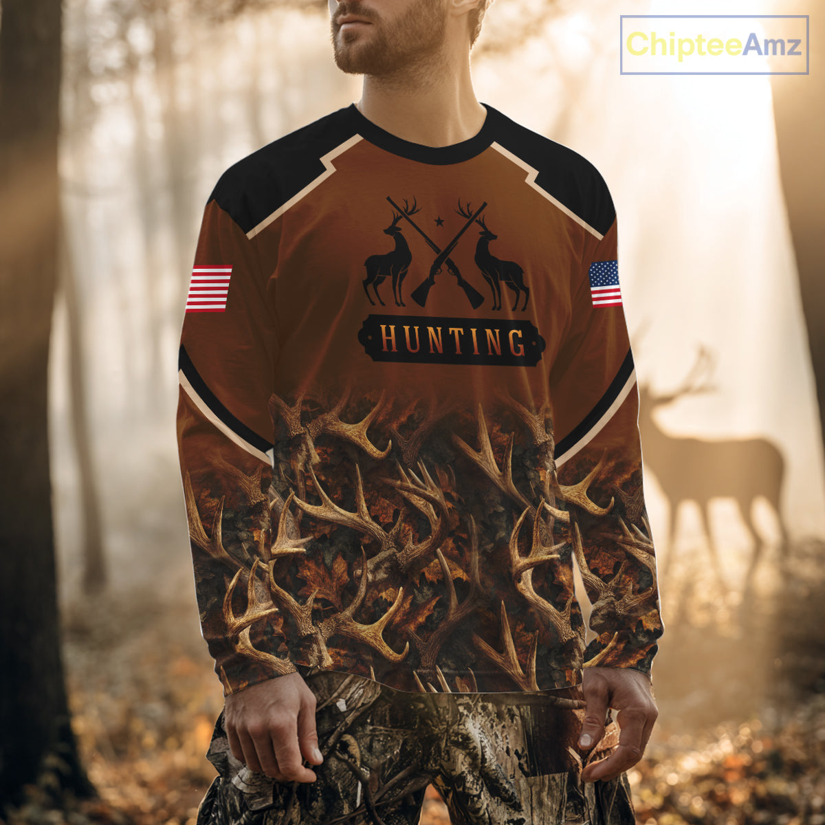 Brown Camo Deer Hunting Shirts with American Flag for Men, Hunting Gift Ideas for Hunters NBT223