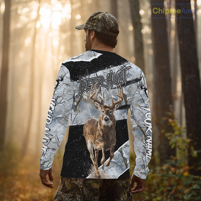 Winter Whitetail Deer Camo Customize Name 3D Printed Long Sleeve Hunting Shirts for Men, Hunting Gifts NBT260
