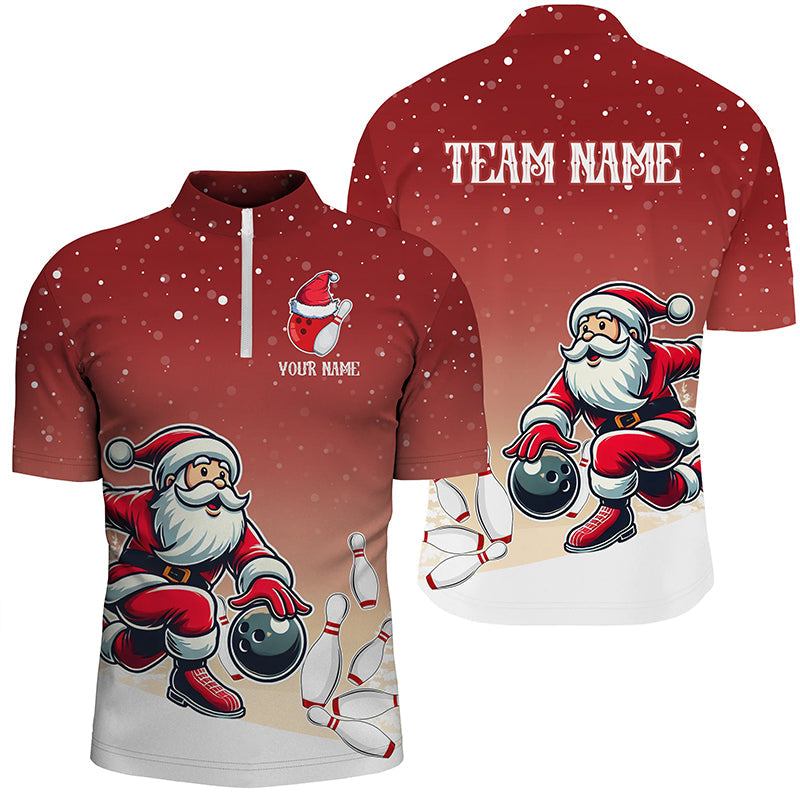 Christmas Santa Bowling Polo, Quarter Zip Shirts For Men Custom Christmas Bowling Team Jerseys | Red NQS8787