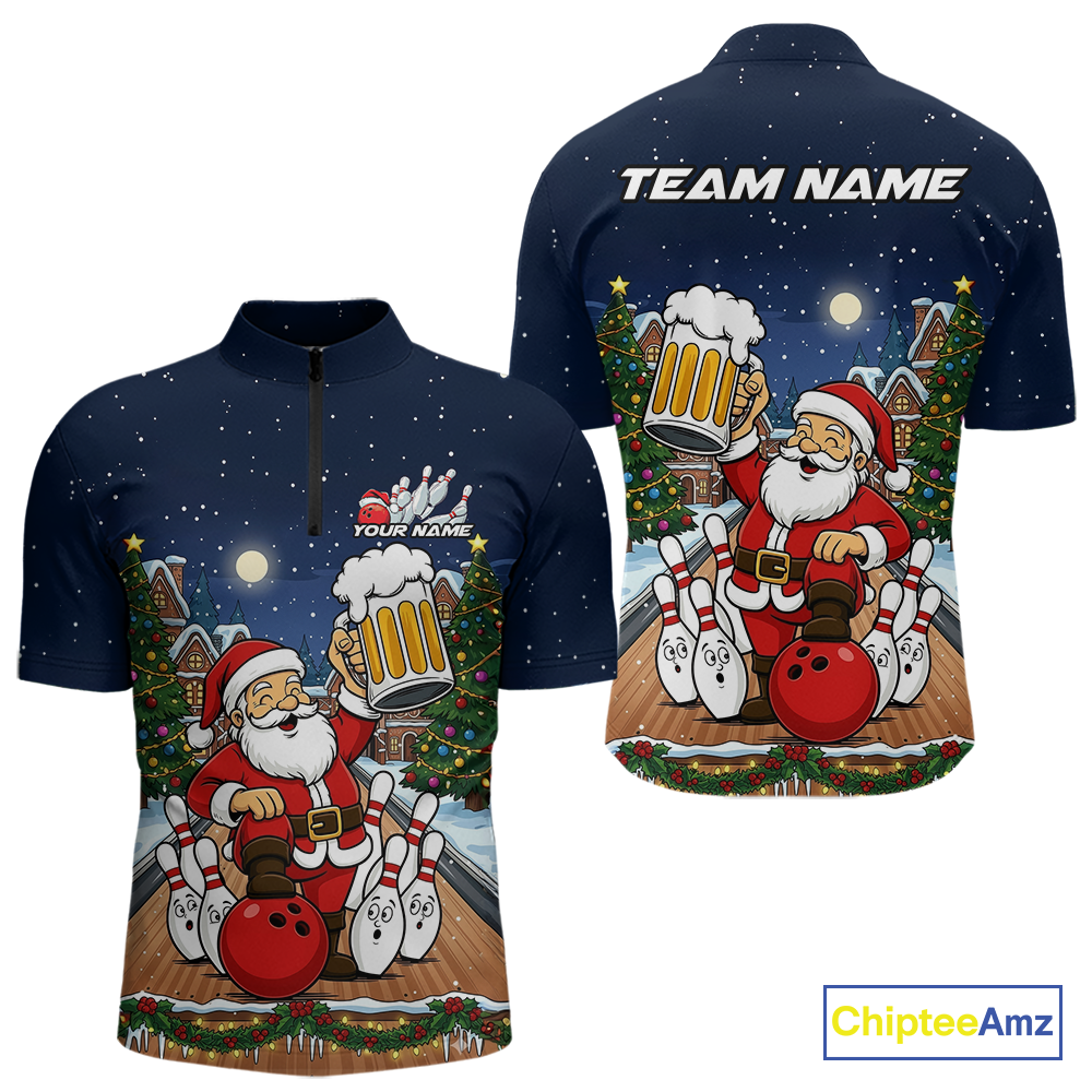 Custom Funny Beer Santa Christmas Bowling Jersey for Men Bowling Team Shirts Polo & 1/4 Zip HNT140