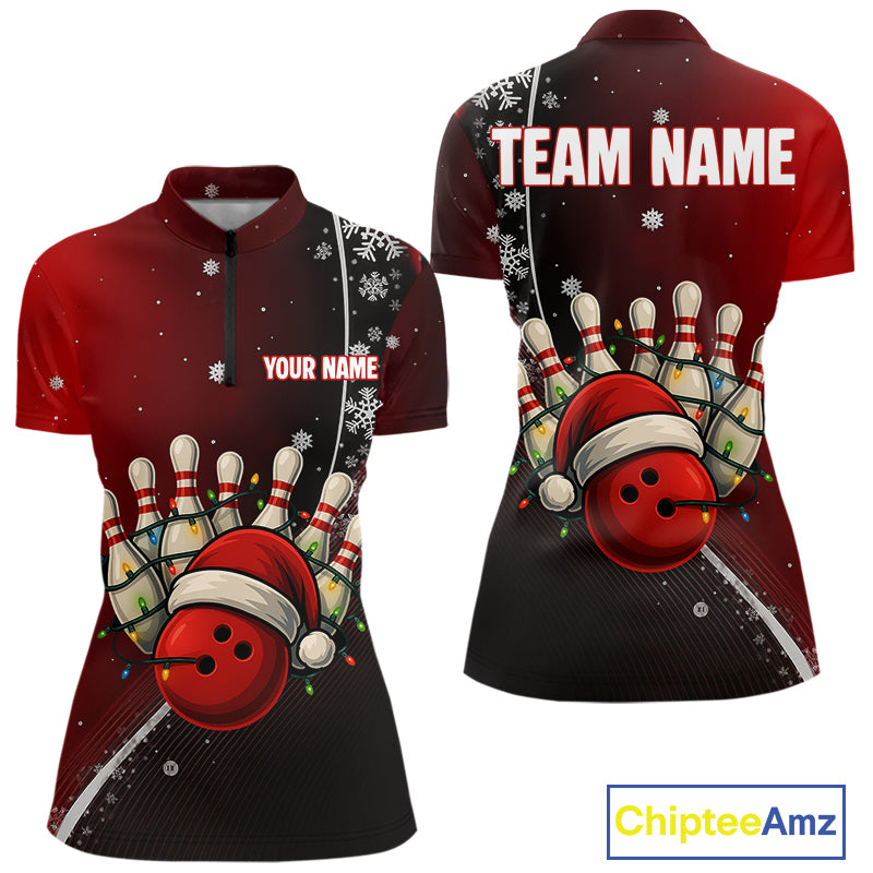 Custom Funny Christmas Bowling Shirts For Women, Black & Red Gradient Xmas Bowling Outfit Bowler Gift NQS10692