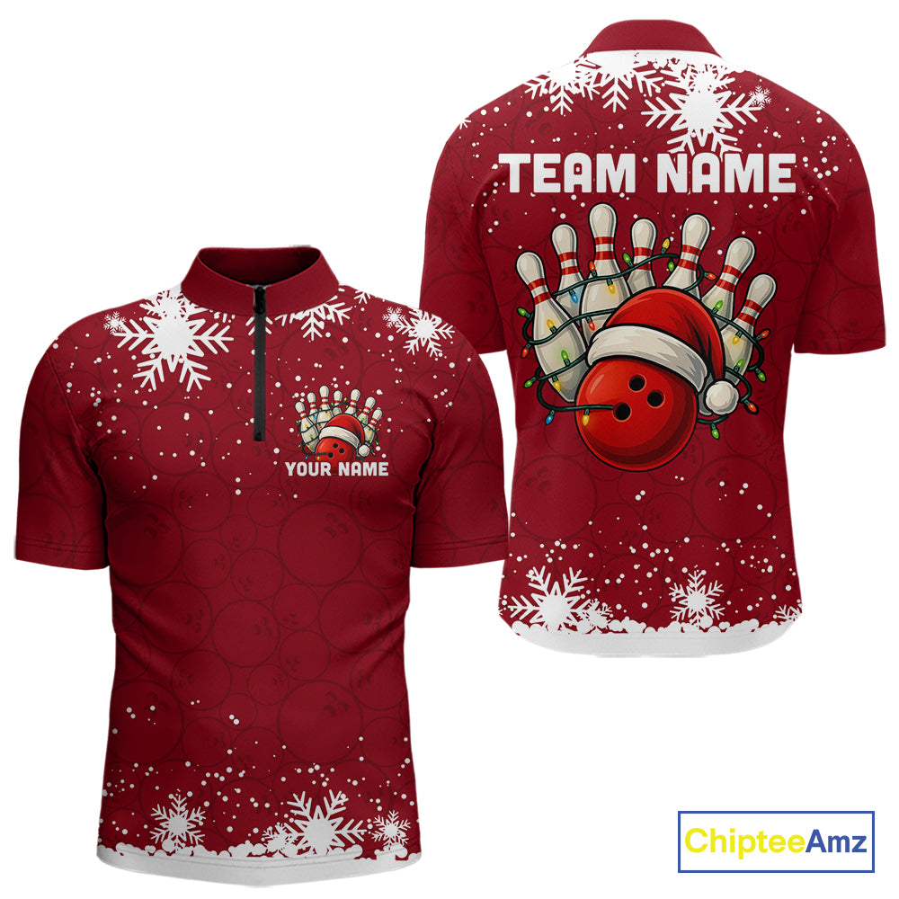 Red Christmas Bowling snowflake Men's Bowling Polo, Quarter Zip shirts Custom Xmas Bowling Outfits NQS10949