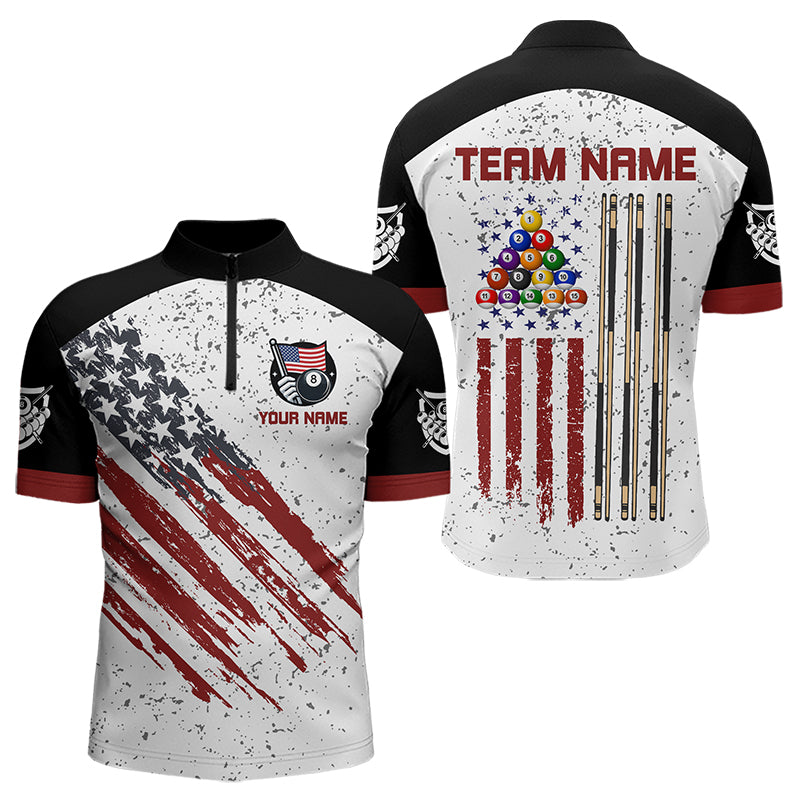 Black White Grunge American Flag Custom Billiard Shirts For Men, Patriotic Team Player Pool Jerseys TDM3405