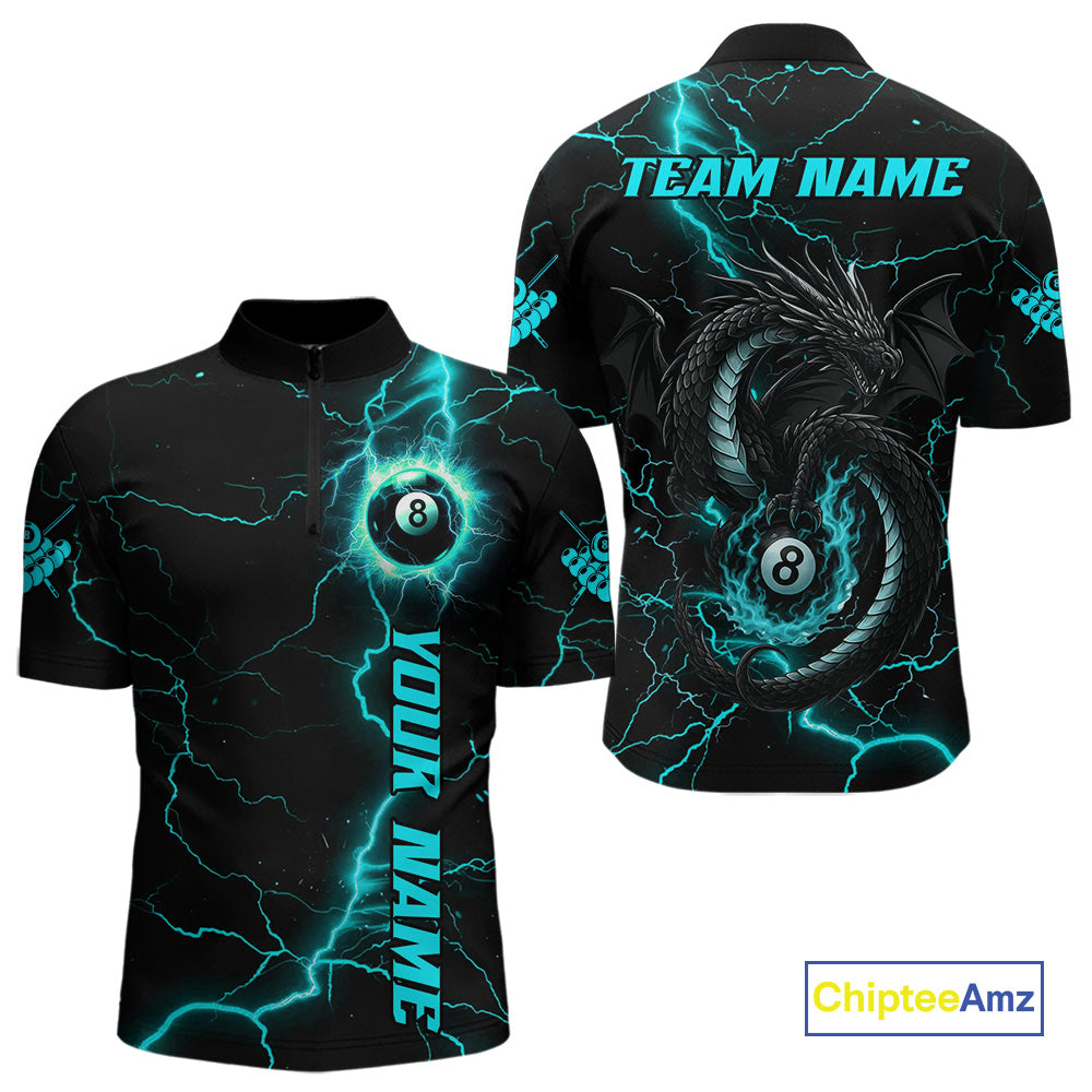 Black And Turquoise 8 Ball Lightning Custom Dragon Men's Billiard Shirts, Billiard Team Jerseys TDM4072