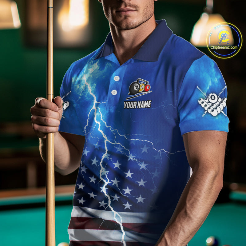 Blue Thunder Lightning American Flag Billiard Shirt For Men Custom Patriotic Pool Balls Jersey TDM4639