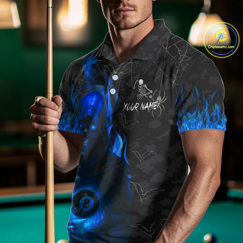 Customized Blue Flaming Grim Reaper 8 Ball Pool Billiard Shirt For Men, Halloween Billiard Outfit TDM4789