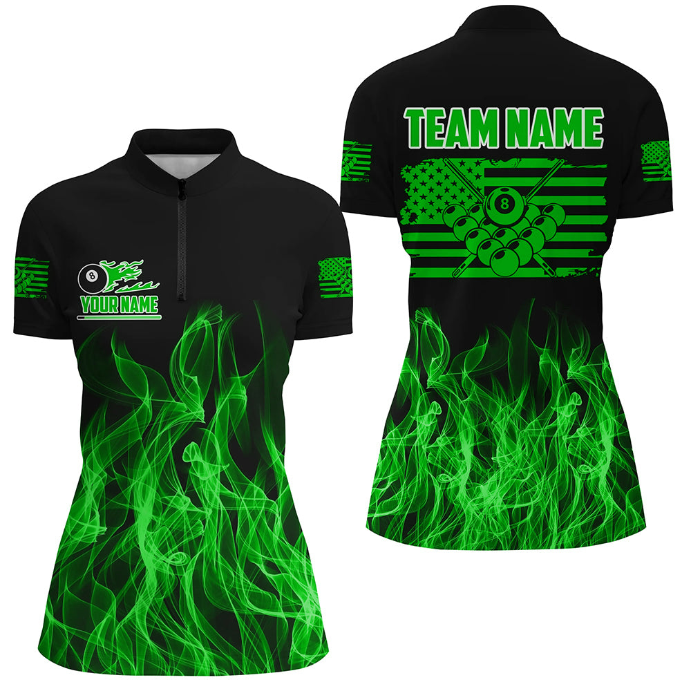 3D Green Flaming American Flag Women Billiard Shirt Custom Patriotic Pool Player Billiard Jersey TDM3452