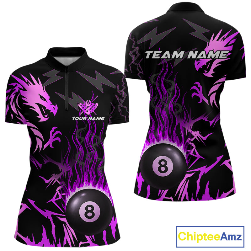 Black And Purple Flaming 8 Ball Pool Shirt For Women Custom Dragon Billiard Jersey Polo & 1/4 Zip TDM4813